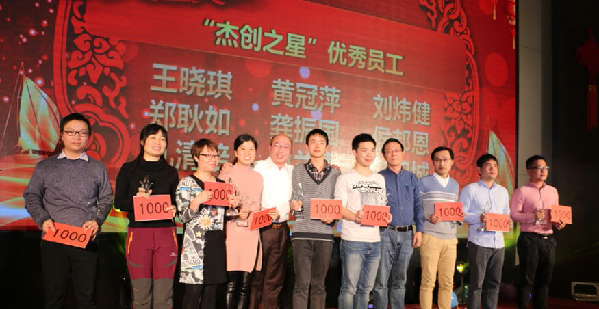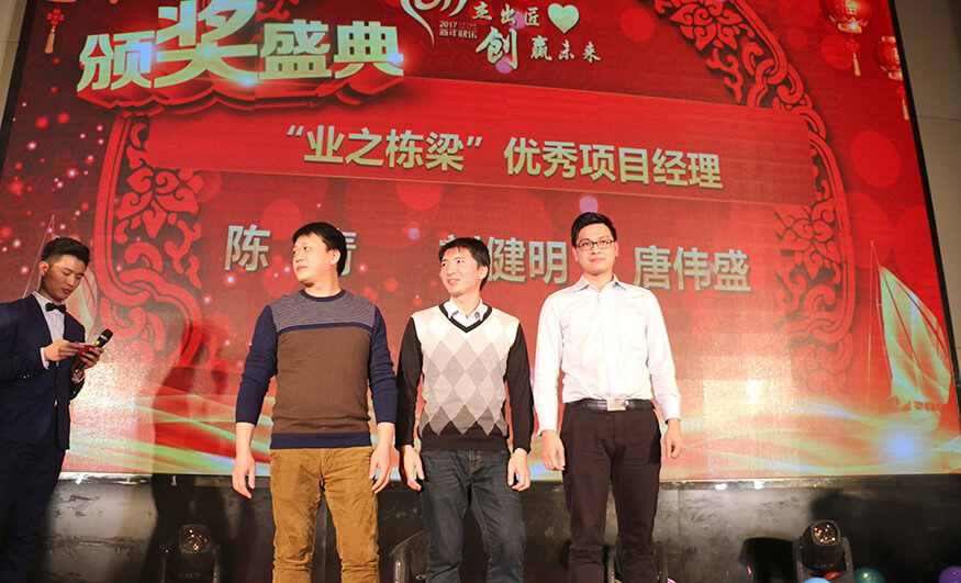 作为整场年会的重头戏,颁奖典礼隆重而喜庆。在阵阵热烈的掌声和欢呼声中,获奖的先进个人和团队一一揭晓,登台领奖。优秀项目经理、优秀工程师、优秀技术员、优秀施工员、优秀实习生、优秀员工、最佳服务之星、最佳长驻明星、最佳外派之星、最佳项目组(大亚湾项目组)、精诚合作奖(深圳团队)、锐意开拓奖(福建团队)、天降雄兵(蓝玛星际),共13组奖项,27位优秀个人,4个先进团队,成为了年会上最闪耀的主角。